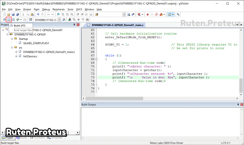 本篇的 Keil 專案檔建立,採用來自 [2.1.2] 網頁的 EFM8BB21F16G-C-QFN2-_Demo01 專案。因為只需要做專案的設置,而不需要做任何程式方面的變更,所以請依照本篇網頁裡面步驟自行建置。